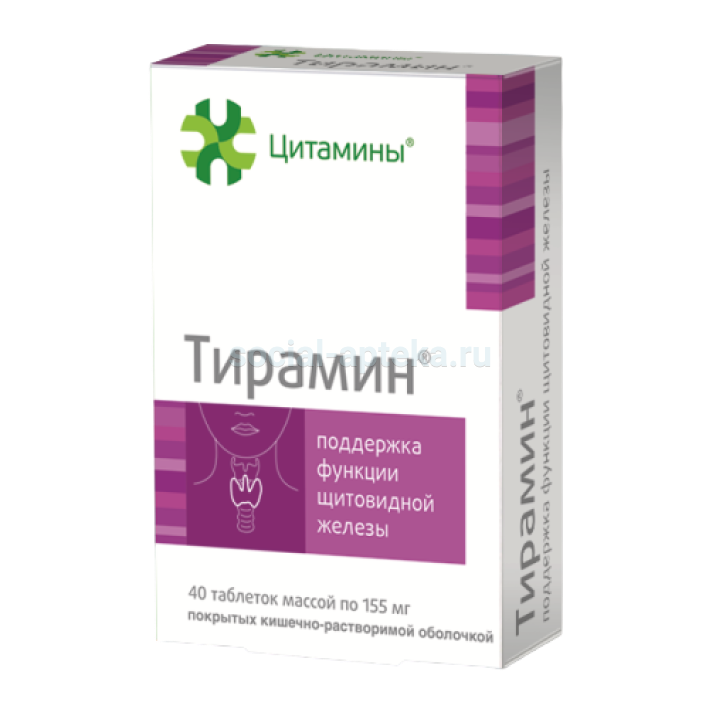 Компоненты для Тирамина, получаемые из щитовидных желез крупного рогатого скота, представляют собой комплекс белков и нуклеопротеидов, обладающих избирательным действием на клетки щитовидной железы, что способствует восстановлению ее функционально-органических свойств. Клинические испытания Тирамина проводились у 180 больных первичным гипотиреозом. У пациентов с первичным гипотиреозом доминировали субъективные проявления астеноневротического и астеновегетативного синдромов. По результатам инструментальных исследований определялись признаки гипо- и атрофических изменений в щитовидной железе. Заключение об эффективности применения Тирамина сделано на основании динамики субъективных жалоб и показателей лабораторных и инструментальных исследований, а также контроля содержания гормонов тиреоидной группы в крови. В результате клинических исследований установлено, что курсовой прием Тирамина способствует улучшению течения заболевания в 84% случаев, причем наибольший эффект наблюдается у лиц старшей возрастной группы с выраженными признаками атрофических изменений щитовидной железы. На фоне приема Тирамина происходило повышение работоспособности, уменьшение частоты и интенсивности головных болей, а также кардиалгии с нормализацией параметров ЭКГ. Выявлено повышение содержания всех тиреоидных гормонов до субнормальных величин, что может свидетельствовать о стабилизирующем влиянии компонентов Тирамина на клеточный метаболизм железы и положительном действии на обменные процессы в целом. Тирамин® рекомендуется применять при нарушении функции щитовидной железы, гипо- и гиперфункции, опухолевых процессах в железистой ткани. В качестве профилактического средства Тирамин® целесообразно применять лицам, проживающим в районах, эндемичных в отношении заболеваний щитовидной железы. Прием Тирамина также рекомендуется лицам старшего и пожилого возраста для поддержания функции щитовидной железы. Тирамин® является натуральным продуктом, не содержит консервантов, красителей и ароматизаторов.