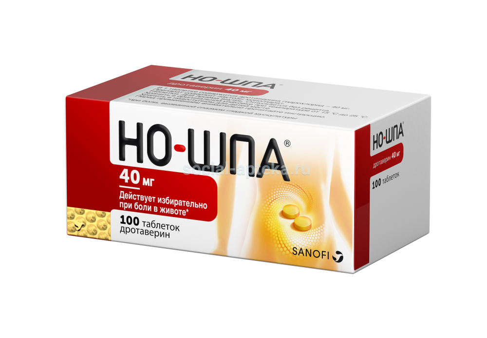 Но-шпа - спазмолитическое средство.ФармакодинамикаДротаверин представляет собой производное изохинолина. Проявляет мощное спазмолитическое действие на гладкую мускулатуру за счет ингибирования фермента фосфодиэстеразы (ФДЭ). Фермент ФДЭ необходим для гидролиза цАМФ до АМФ. Ингибирование ФДЭ приводит к повышению концентрации цАМФ, которое запускает следующую каскадную реакцию: высокие концентрации цАМФ активируют цАМФ-зависимое фосфорилирование киназы легких цепей миозина (КЛЦМ), фосфорилирование КЛЦМ приводит к понижению ее аффинности к Ca2+-кальмодулиновому комплексу, в результате чего инактивированная форма КЛЦМ поддерживает мышечное расслабление. цАМФ кроме этого влияет на цитозольную концентрацию иона Ca2+благодаря стимулированию транспорта Ca2+ в экстрацеллюлярное пространство и саркоплазматический ретикулум. Этот понижающий концентрацию иона Ca2+ эффект дротаверина через цАМФ объясняет антагонистический эффект дротаверина по отношению к Ca2+.In vitro дротаверин ингибирует изофермент ФДЭ4 без ингибирования изоферментов ФДЭ3 и ФДЭ5. Поэтому эффективность дротаверина зависит от концентраций ФДЭ4 в тканях, которые в разных тканях различаются. ФДЭ4 наиболее важна для подавления сократительной активности гладкой мускулатуры, в связи с чем селективное ингибирование ФДЭ4 может быть полезным для лечения гиперкинетических дискинезий и различных заболеваний, сопровождающихся спастическим состоянием ЖКТ.Гидролиз цАМФ в миокарде и гладкой мускулатуре сосудов происходит, главным образом с помощью изоэнзима ФДЭ3, чем объясняется тот факт, что при высокой спазмолитической активности у дротаверина отсутствуют серьезные побочные эффекты со стороны сердца и сосудов и выраженные эффекты в отношении ССС.Дротаверин эффективен при спазмах гладкой мускулатуры как нейрогенного, так и мышечного происхождения. Независимо от типа вегетативной иннервации, дротаверин расслабляет гладкую мускулатуру ЖКТ, желчевыводящих путей, мочеполовой системы.Вследствие своего сосудорасширяющего действия дротаверин улучшает кровоснабжение тканей.ФармакокинетикаДротаверин при приеме внутрь быстро и полностью абсорбируется из ЖКТ. Абсорбция составляет 100%. Однако после метаболизма при первом прохождении через печень в системный кровоток поступает 65% принятой дозы. Cmax в плазме достигается через 45–60 мин.In vitro дротаверин имеет высокую связь с белками плазмы (95–97%), особенно с альбумином, γ- и β- глобулинами.Дротаверин равномерно распределяется по тканям, проникает в гладкомышечные клетки. Не проникает через ГЭБ. Дротаверин и/или его метаболиты могут незначительно проникать через плацентарный барьер.У человека дротаверин почти полностью метаболизируется в печени путем O-дезэтилирования. Его метаболиты быстро конъюгируют с глюкуроновой кислотой. Главным метаболитом является 4'-дезэтилдротаверин, кроме которого были идентифицированы 6-дезэтилдротаверин и 4'-дезэтилдротавералдин.T1/2 дротаверина составляет 8–10 ч. В течение 72 ч дротаверин практически полностью выводится из организма. Более 50% препарата выводится почками (в основном в виде метаболитов) и около 30% — через ЖКТ (экскреция в желчь). Неизмененный дротаверин в моче не обнаруживается.