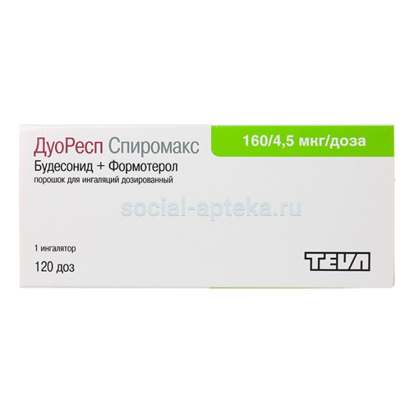 Рекомендуется постепенно уменьшать дозу препарата перед прекращением лечения и не рекомендуется резко отменять лечение.Препарат ДуоРесп Спиромакс не применяется для первоначального подбора терапии на первых этапах лечения бронхиальной астмы.Прием формотерола может вызвать удлинение интервала QT.Увеличение частоты приема бронходилататоров в качестве препаратов неотложной помощи указывает на ухудшение течения основного заболевания и служит основанием для пересмотра тактики лечения бронхиальной астмы.Неожиданное и прогрессирующее ухудшение контроля симптомов бронхиальной астмы или ХОБЛ является потенциально угрожающим для жизни состоянием и требует срочного медицинского вмешательства. В данной ситуации следует рассмотреть возможность повышения дозы ГКС или добавления системной противовоспалительной терапии, например курса пероральных ГКС или лечения антибиотиками в случае присоединения инфекции. Пациентам рекомендуется постоянно иметь при себе препараты неотложной помощи (β2-адреномиметики короткого действия). Следует обратить внимание пациента на необходимость регулярного приема препарата ДуоРесп Спиромакс в соответствии с подобранной дозой даже в случаях отсутствия симптомов заболевания.Лечение препаратом ДуоРесп Спиромакс не следует начинать в период обострения или значительного ухудшения течения бронхиальной астмы.Как и при любой другой ингаляционной терапии, возможно возникновение парадоксального бронхоспазма с немедленным усилением хрипов после приема дозы препарата. В связи с чем следует прекратить терапию препаратом ДуоРесп Спиромакс, пересмотреть тактику лечения и, при необходимости, назначить альтернативную терапию. Системное действие может проявиться при приеме любых ингаляционных ГКС, особенно при приеме высоких доз препаратов в течение длительного периода времени. Проявление системного действия менее вероятно при проведении ингаляционной терапии, чем при использовании пероральных ГКС. К возможным системным эффектам относятся подавление функции надпочечников, снижение МПКТ, катаракта и глаукома.Основываясь на ограниченных данных исследований о длительном приеме ГКС, можно предположить, что большинство детей и подростков, получающих терапию ингаляционным будесонидом, в конечном итоге достигнут нормальных для взрослых показателей роста. Вместе с тем сообщалось о незначительной (приблизительно на 1 см), кратковременной задержке роста, в основном в первый год лечения.Из-за потенциально возможного действия ингаляционных ГКС на МПКТ следует уделять особое внимание пациентам, принимающим высокие дозы препарата в течение длительного периода с наличием факторов риска остеопороза. Исследования длительного применения ингалируемого будесонида у детей в средней суточной дозе 400 мкг (отмеренная доза) или взрослых в суточной дозе 800 мкг (отмеренная доза) не показали заметное действие на МПКТ. Нет данных относительно действия высоких доз препарата ДуоРесп Спиромакс на МПКТ.Если есть основания полагать, что на фоне предшествующей системной терапии ГКС была нарушена функция надпочечников, следует принять меры предосторожности при переводе пациентов на лечение препаратом ДуоРесп Спиромакс. Преимущества ингаляционной терапии будесонидом, как правило, сводят к минимуму нео