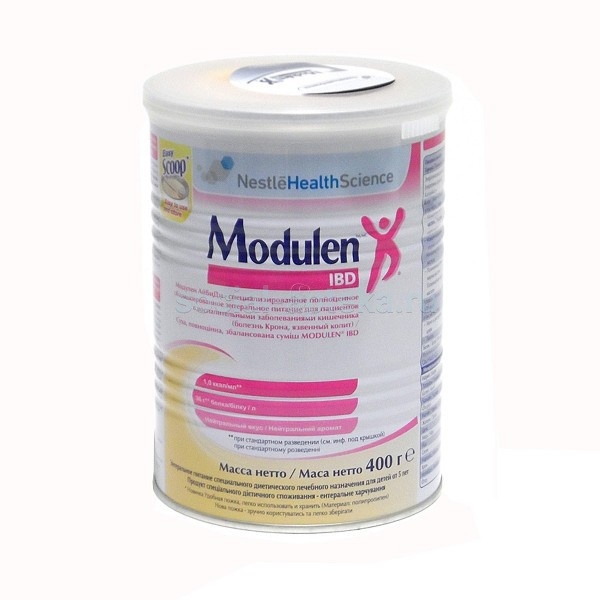 Смесь Modulen® IBD – это специализированное полноценное сбалансированное энтеральное питание для пациентов с воспалительными заболеваниями кишечника (болезнь Крона, язвенный колит), а также при поражениях слизистых оболочек. Смесь Modulen® IBD – это энтеральное специализированное питание для диетического лечебного питания детей старше 5 лет и взрослых. Может использоваться в качестве единственного источника питания. Преимущества -Может применяться как первоначальная терапия без применения лекарственных препаратов или снизить приём лекарственных препаратов и их побочных эффектов; -До 80 % ремиссии можно достичь применением Modulen IBD, снижает активность заболевания; -Трансформирующий фактор роста бета-2: -Местное и системное подавление аутоиммунных реакций; -Уменьшение воспалительной реакции; -Способствует репарации поврежденных тканей; -Вызывает развитие толерантности к чужеродным антигенам; -Регуляция иммунного ответа. -Жировой компонент смеси на 25 % состоит из среднецепочечных триглицеридов – усваиваются без участия желчных кислот, ферментов поджелудочной железы и щеточной каймы кишечника; -Соотношение омега-6:омега-3 = 11:1 – противовоспалительный эффект; -Не содержит лактозу и глютен. Объем мерной ложки: 8.3 г