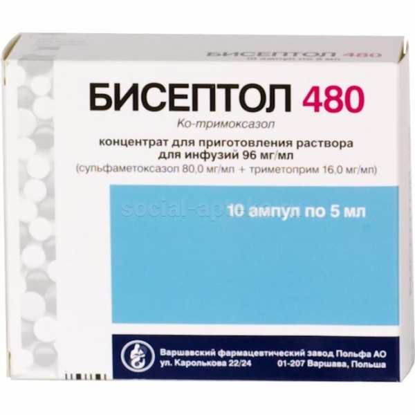 Комбинированный антибактериальный препарата, содержащий сульфаметоксазол, обладающий средней длительностью действия, тормозящий синтез фолневой кислоты путем конкурентного антагонизма с парааминобензойной кислотой, а также триметолрим-ингибитор бактериальной редуктазы дигидрофолиевой кислоты. Сочетание обоих препаратов дает еннергический эффект антибактериального действия в связи с чем бактериальная устойчивость проявляется реже, по сравнению с другими препаратами. Бисептол обладает широким спектром антибактериального действия. Он активен в отношении : Streptococcus (Streptococcus pneumoniae), Neisseria meningitidis, Neisseria gonorrhoeae (включая энтеротоксогенные штаммы), Staphylococcus, Escherichia coli, Klebsiella, Enterobacter, Proteus mirabilis, Proteus spр., Haemophilus influenzae, Salmonella spp. (включая Salmonella typhi и Salmonella paratyphi), Vibrio cholerae, Bacillus anthracis, Listeria spp., Nocardia asteroides, Bordclella pertussis, Enterococcus faecalis, Pasteurella spp., Brucella spp., Mycobacterium spp. (в т.ч. Mycobacterium leprae), Citrobacter, Enterobacter spp., Legionella pneumonia, Providencia, некоторые виды Pseudomonas (кроме P.аerugenosa), Serratia marcescens, Yersinia spp., Morganella spp., Chlamydia spp. (в т.ч. Chlamydia trachomatis, Chlamydia psittaci), Shigella, Plasmodium spp., Toxoplasma gondii, Pneumocystis carini, Actinomyces israelii, Coccidioides immitis, Histoplasma capsulatum, Leishmania spp. Устойчивы к препарату: Corynebacterium spp., Pseudomonas aerugenosa, Mycobacterium tuberculosis, Troponema spp., Leptospira spp., вирусы. Угнетает жизнедеятельность кишечной палочки, приводит к уменьшению синтеза тиамина, рибофлавина, никотиновой кислоты и дрругих витаминов группы В в кишечнике. Продолжительность терапевтического эффекта составляет 7 ч.