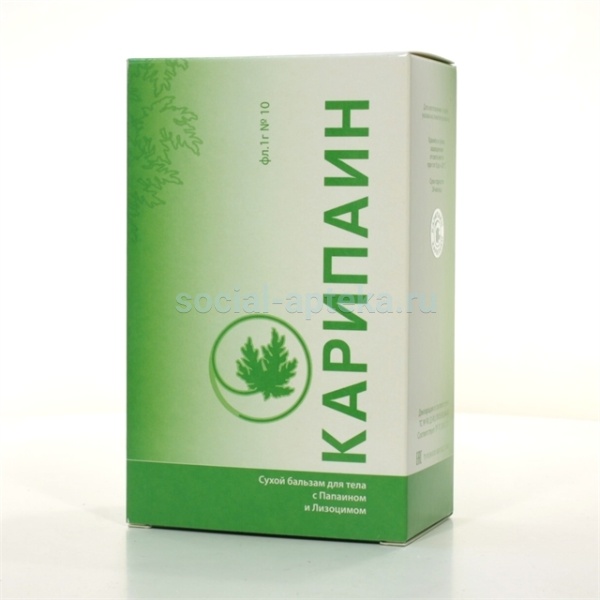 Сухой бальзам Карипаин - протеолитический ферментный препарат прямого действия растительного происхождения, полученный из латекса папайи. Карипаин характеризуется протеолитической активностью широкого спектра, Единицы активности выражаются по классификации международной федерации фармацевтики (1 фл Карипаина соответствует 350 Fip-ПЕ). Является полным аналогом грузинского препарата Карипазим.Карипаин - высокоэффективный препарат, применяемый при остеохондрозе позвоночника, в том числе при различных формах грыж межпозвонковых дисков, грыжах Шморля, для лечения суставных контрактур (посттравматических и постинсультных), келоидных рубцов различного происхождения, дискогенного радикулита, туннельного синдрома.