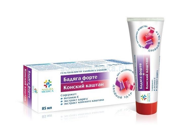 Гель-бальзам косметический "Бадяга форте и Конский каштан". Экстракт бадяги в сочетании с экстрактом конского каштана оказывает мощное противоотечное и сосудоукрепляющее действие. Способствует быстрой регенерации тканей, укреплению стенок кровеносных сосудов и капилляров, уменьшению отеков и рассасыванию гематом, обладает успокаивающим действием. Конский каштан оказывает мощное венотонизирующее и противоотечное действие, укрепляет стенки сосудов, улучшает крово- и лимфообращение, снимает отечность