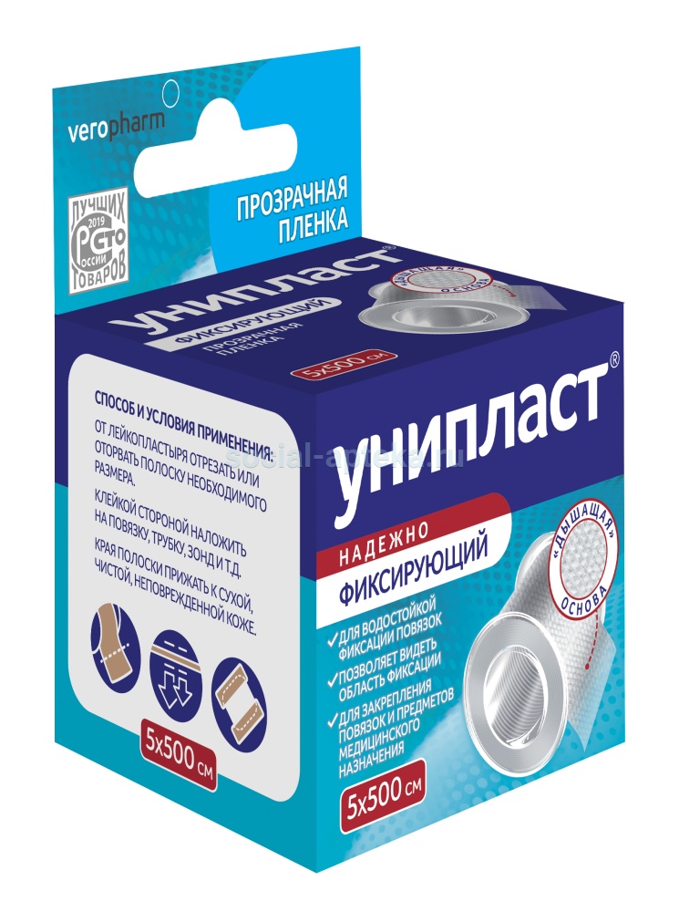 Современный гипоаллергенный фиксирующий пластырь на основе перфорированной пленки, прозрачен, незаметен на коже, не пропускает воду и позволяет коже «дышать». Легко рвется без использования ножниц. Лейкопластырь «Унипласт Фиксирующий» производится с использованием гипоаллергенного полиакрилатного клея, на 5 различных основах: на основе нетканого материала; на основе прозрачной пленки; на основе шелка; на тканевой основе; на основе сетчатого нетканого материала