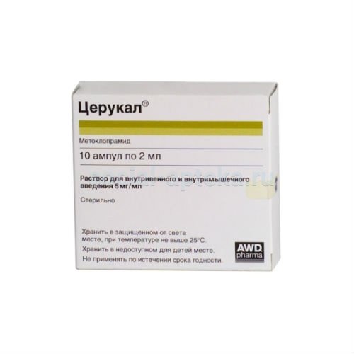 ЦЕРУКАЛ - противорвотное средство, является специфическим блокатором дофаминовых (D2) и серотониновых рецепторов. Механизм действия основан как на центральном, так и на периферическом воздействии метоклопрамида. Противорвотное действие связано с блокадой дофаминовых рецепторов головного мозга, что обуславливает повышение порога раздражения рвотного центра. Оказывает противорвотное действие, устраняет тошноту и икоту. Снижает двигательную активность пищевода, повышает тонус нижнего сфинктера пищевода, ускоряет опорожнение желудка, а также ускоряет продвижение пищи по тонкой кишке, не вызывая диарею. Нормализует выделение желчи, уменьшает спазм сфинктера Одди, не изменяет его статус, устраняет дискинезию желчного пузыря. Стимулирует секрецию пролактина.ФармакокинетикаVd составляет 2.2 - 3.4 л/кг.Метаболизуется в печени. Период полувыведения составляет от 3-х до 5 ч, при хронической почечной недостаточности – 14 ч. Выводится почками в течение первых 24 ч в неизмененном виде и в виде метаболитов (около 80% и однократно принятой дозы). Легко проникает через гематоэнцефалический барьер и выделяется с грудным молоком.