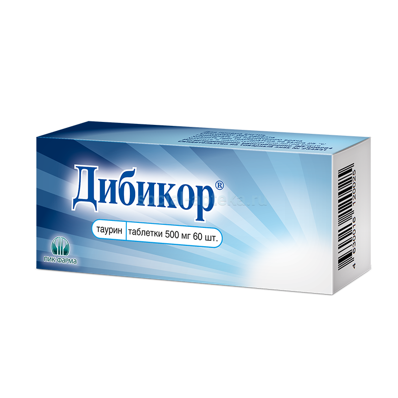 Дибикор - метаболическое. Фармакодинамика Таурин является естественным продуктом обмена серосодержащих аминокислот: цистеина, цистеамина, метионина. Таурин обладает осморегуляторным и мембранопротекторным свойствами, положительно влияет на фосфолипидный состав мембран клеток, нормализует обмен ионов кальция и калия в клетках. У таурина выявлены свойства тормозного нейромедиатора, он обладает антистрессорным действием, может регулировать высвобождение ГАМК, адреналина, пролактина и других гормонов, а также регулировать ответы на них. Участвуя в синтезе белков дыхательной цепи в митохондриях, таурин регулирует окислительные процессы и проявляет антиоксидантные свойства; влияет на ферменты, такие как цитохромы, ответственные за метаболизм различных ксенобиотиков. Дибикор® улучшает метаболические процессы в сердце, печени и других органах и тканях. При хронических диффузных заболеваниях печени Дибикор® увеличивает кровоток и уменьшает выраженность цитолиза. Лечение препаратом Дибикор® при сердечно-сосудистой недостаточности (ССН) ведет к уменьшению застойных явлений в малом и большом кругах кровообращения: снижается внутрисердечное диастолическое давление, повышается сократимость миокарда (максимальная скорость сокращения и расслабления, индексы сократимости и релаксации). Препарат умеренно снижает АД у пациентов с артериальной гипертензией и практически не влияет на его уровень у больных с ССН с пониженным АД. Дибикор® уменьшает побочные явления, возникающие при передозировке сердечных гликозидов и блокаторов «медленных» кальциевых каналов; снижает гепатотоксичность противогрибковых препаратов. Повышает работоспособность при тяжелых физических нагрузках. При сахарном диабете приблизительно через 2 нед после начала приема препарата Дибикор®снижается уровень сахара в крови. Замечено также значительное уменьшение концентрации триглицеридов, в меньшей степени — уровня холестерина, уменьшение атерогенности липидов плазмы. При длительном применении препарата (около 6 мес) отмечено улучшение микроциркуляторного кровотока глаза. Фармакокинетика После однократного приема 500 мг Дибикора® действующее вещество (таурин) определяется в крови через 15–20 мин, Cmax достигается через 1,5–2 ч. Полностью препарат выводится через сутки.