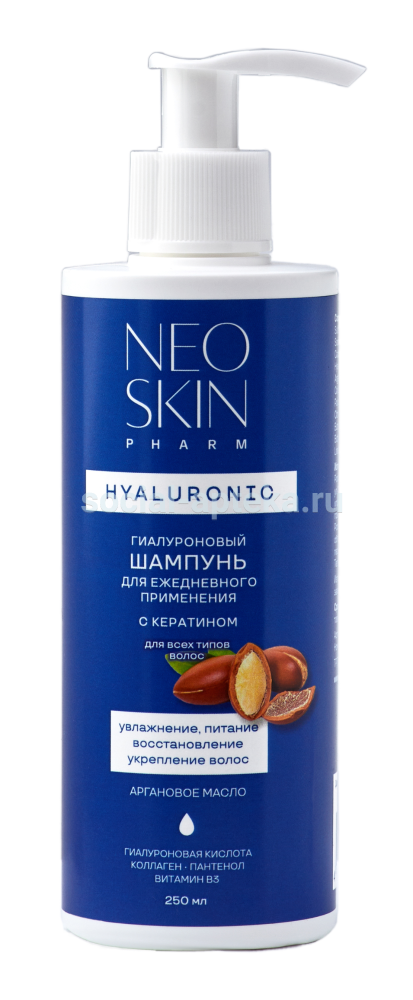 Гиалуроновый шампунь с аргановым маслом мягко очищает волосы, питает и восстанавливает их по всей длине, защищает от термовоздействия и способствует росту здоровых волос. Кератин заполняет повреждённые участки волосяного стержня, пантенол увлажняет и уплотняет волосы, коллаген удерживает влагу и разглаживает поверхность волос. При ежедневном использовании локоны приобретают невероятную эластичность, становясь ещё сильнее после сушки феном.