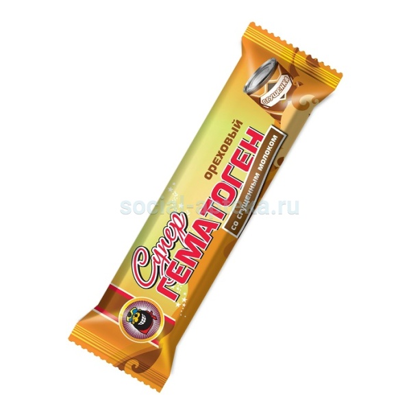 Сахарная пудра, глазурь шоколадная (сахар, заменитель масло-какао, какао-продукты, эмульгатор лецитин, ароматизатор идентичный натуральному "ванилин"), гемоглобин порошкообразный, патока, молоко сгущенное вареное, рис воздушный, изделия из ядер орехов, молоко сухое обезжиренное, молочная сухая сыворотка, вода питьевая, какао-порошок, соль поваренная, аскорбиновая кислота.