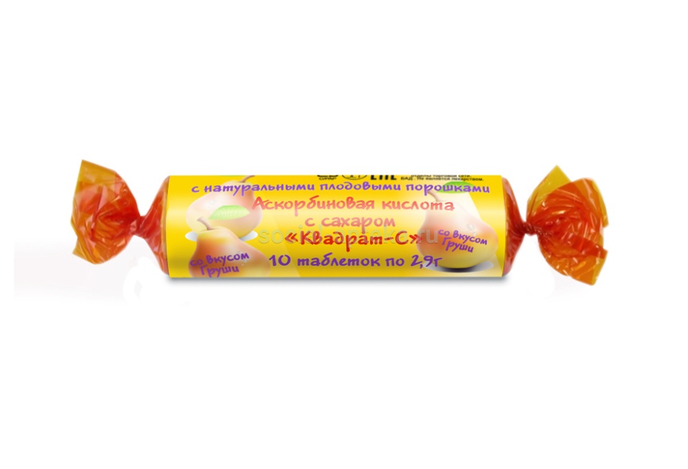 аскорбиновая к-та; натуральный плодовый порошок, сахар, глюкоза, крахмал картофельный, к-та стеариновая, ароматизатор индентичный натуральному
