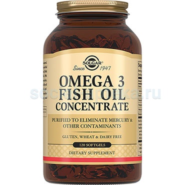 Солгар «Концентрат рыбьего жира Омега-3» - источник натурального рыбьего жира с оптимальным содержанием омега-3 полиненасыщенных жирных кислот. Продукт получен из рыб, обитающих в холодных водах, щадящим методом холодного прессования, что позволяет сохранить действующие компоненты в каждой капсуле. Для очистки рыбьего жира от примесей и тяжелых металлов компания Солгар использует современную методику очистки - молекулярную дистилляцию. А для того, чтобы защитить рыбий жир от окисления и прогоркания в каждую капсулу Солгар «Концентрат рыбьего жира Омега-3» добавлен антиоксидант - натуральный витамин Е (смесь токоферолов).