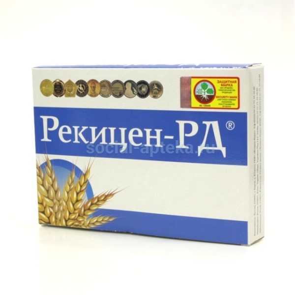 В составе «Рекицена-РД» - до 44% углеводов (из них 31,2% крахмала), до 17, % белков (в т.ч. более 18 видов незаменимых аминокислот), 11, 9 % клетчатки, 2,3% жиров, 1,3% нуклеиновых кислот, 0,15 % пектинов.«Рекицен-РД» содержит не только большое количество полезной клетчатки, определяющей широкий спектр его лечебных свойств, но и отличается также высоким содержанием важных для организма человека витаминов (E, B1, B2, B3 (PP), B4, B5, B6, B7, B12, K, H, D2), макро- и микроэлементов (натрий, фосфор, калий, магний, кальций, железо, медь, марганец, цинк, никель, йод).