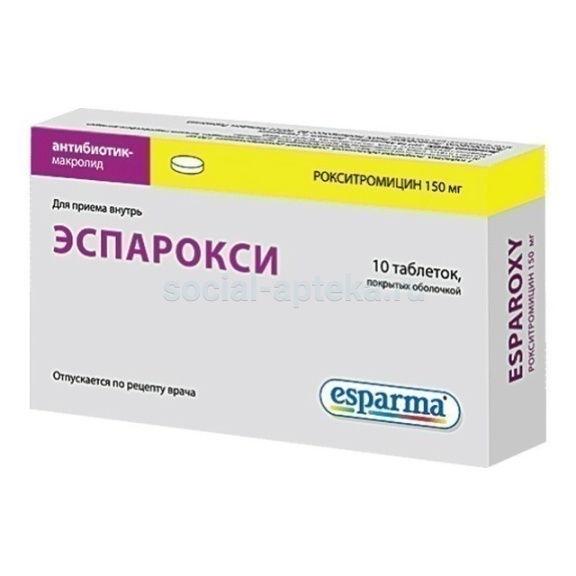 Сообщалось о резко выраженном сужении сосудов ("эрготизме") с возможным развитием некроза конечностей при сочетании приема макролидов с сосудосуживающими алколоидами спорыньи. Поэтому перед назначением рокситромицина следует обязательно выяснить у пациента, не принимает ли он эти алколоиды (см. "Взаимодействие с другими лекарственными средствами"). Тяжелые буллезные реакции. При применении рокситромицина отмечались случаи тяжелых буллезных реакций, таких как синдром Стивенса-Джонсона или токсический эпидермальный некролиз (см. "Побочное действие"). При появлении симптомов или признаков синдрома Стивенса-Джонсона, или токсического эпидермального некролиза (например, прогрессирующей кожной сыпи, часто с появлением волдырей или повреждением слизистых оболочек) лечение препаратом ЭСПАРОКСИ* должно быть прекращено. Влияние на продолжительность интервала QT. При определенных условиях макролиды, включая рокситромицин, могут удлинять интервал QT. Поэтому рокситромицин следует применять с осторожностью у пациентов с врожденным удлинением интервала QT, у пациентов, имеющих состояния, способствующие развитию нарушений сердечного ритма, такие как нескорректированная гипокалиемия или гипомагниемия, клинически значимая брадикардия, и у пациентов, принимающих препараты, которые приводят к развитию желудочковых нарушений ритма, в том числе желудочковой тахикардии типа "пируэт" (см. "Взаимодействие с другими лекарственными средствами"). Следует скорректировать гипокалиемию и гипомагниемию до начала лечения рокситромицином, а лечение проводить под контролем ЭКГ. Применение у пациентов с печеночной недостаточностью. При применении препарата у пациентов с тяжелой печеночной недостаточностью (например, при циррозе печени с желтухой или асцитом) необходимо двукратное снижение суточной дозы рокситромицина (например, до 150 мг 1 раз в сутки у взрослых) (см. "Способ применения и дозы"). Применение у пациентов с почечной недостаточностью и пациентов пожилого возраста. Почечная секреция рокситромицина и его метаболитов составляет приблизительно 10 % от принятой внутрь дозы. При применении препарата у пациентов с почечной недостаточностью, а также у пациентов пожилого возраста коррекции дозы не требуется. Применение у пациентов с астеническим бульбарным параличом (myasthenia gravis). Как и другие макролиды, рокситромицин может утяжелять течение астенического бульбарного паралича, в связи с чем применение рокситромицина у таких пациентов требует особой осторожности и контроля за состоянием пациента. Псевдомембранозный колит, вызываемый Clostridium difficile. Диарея, особенно тяжелая, персистирующая и/или сопровождающаяся кровотечением во время лечения рокситромицином или после него, может быть симптомом псевдомембранозного колита (см. "Побочное действие"). При подозрении на псевдомембранозный колит прием рокситромицина должен быть немедленно прекращен. Нельзя применять лекарственные средства, тормозящие перестальтику кишечника.
