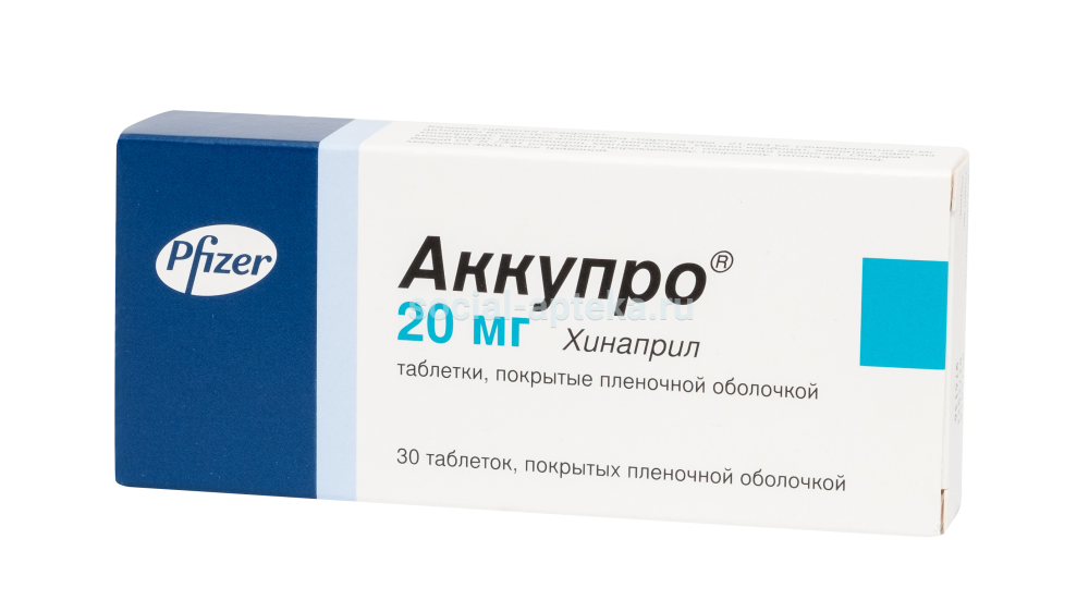 Аккупро - антигипертензивный препарат, ингибитор АПФ. АПФ катализирует превращение ангиотензина I в ангиотензин II, который обладает сосудосуживающим действием и повышает тонус сосудов, в т.ч. за счет стимуляции продукции альдостерона корой надпочечников. Хинаприл конкурентно ингибирует активность АПФ и снижает вазопрессорную активность и выработку альдостерона. Устранение отрицательного влияния ангиотензина II на секрецию ренина по механизму обратной связи приводит к увеличению активности ренина плазмы крови. При этом снижение АД сопровождается уменьшением ОПСС и сопротивления почечных сосудов, в то время как изменения ЧСС, сердечного выброса, почечного кровотока, скорости клубочковой фильтрации и фильтрационной фракции незначительны или отсутствуют.Хинаприл повышает толерантность к физической нагрузке. При длительном применении способствует обратному развитию гипертрофии миокарда у пациентов с артериальной гипертензией; улучшает кровоснабжение ишемизированного миокарда. Усиливает коронарный и почечный кровоток. Снижает агрегацию тромбоцитов.После приема однократной дозы антигипертензивное действие развивается через 1 ч, достигает максимума через 2-4 ч. Продолжительность действия зависит от величины принятой дозы (до 24 ч). Клинически выраженный эффект развивается через несколько недель после начала терапии. Фармакокинетика Всасывание, распределение, метаболизмПосле приема внутрь Cmax хинаприла в плазме крови достигается в течение 1 ч, хинаприлата - в течение 2 ч. Прием пищи не влияет на степень всасывания, но может увеличить время достижения максимальной концентрации (жирная пища может уменьшить всасывание препарата). С учетом выведения хинаприла и его метаболитов почками степень абсорбции препарата составляет около 60%.Под действием печеночных ферментов хинаприл быстро метаболизируется путем отщепления эфирной группы до хинаприлата (основной метаболит - двухосновная кислота хинаприла), который является мощным ингибитором АПФ. Около 38% от принятой внутрь дозы хинаприла циркулирует в плазме крови в виде хинаприлата.Примерно 97% хинаприла или хинаприлата циркулирует в плазме крови в связанном с белками виде. Хинаприл и его метаболиты не проникают через ГЭБ.ВыведениеВыводится главным образом с мочой - 61% (56% в виде хинаприла и хинаприлата), а также через кишечник- 37%. T1/2 хинаприла из плазмы крови составляет около 1-2 ч, хинаприлата - 3 ч.Фармакокинетика в особых клинических случаяхУ пациентов c почечной недостаточностью T1/2 хинаприлата увеличивается по мере снижения КК.Выведение хинаприлата снижается также у пациентов пожилого возраста (старше 65 лет) и тесно коррелирует с нарушениями функции почек, однако в целом различий в эффективности и безопасности лечения пациентов пожилого и более молодого возраста не выявлено.У пациентов с алкогольным циррозом печени концентрация хинаприлата снижается за счет нарушения деэтерификации хинаприла.