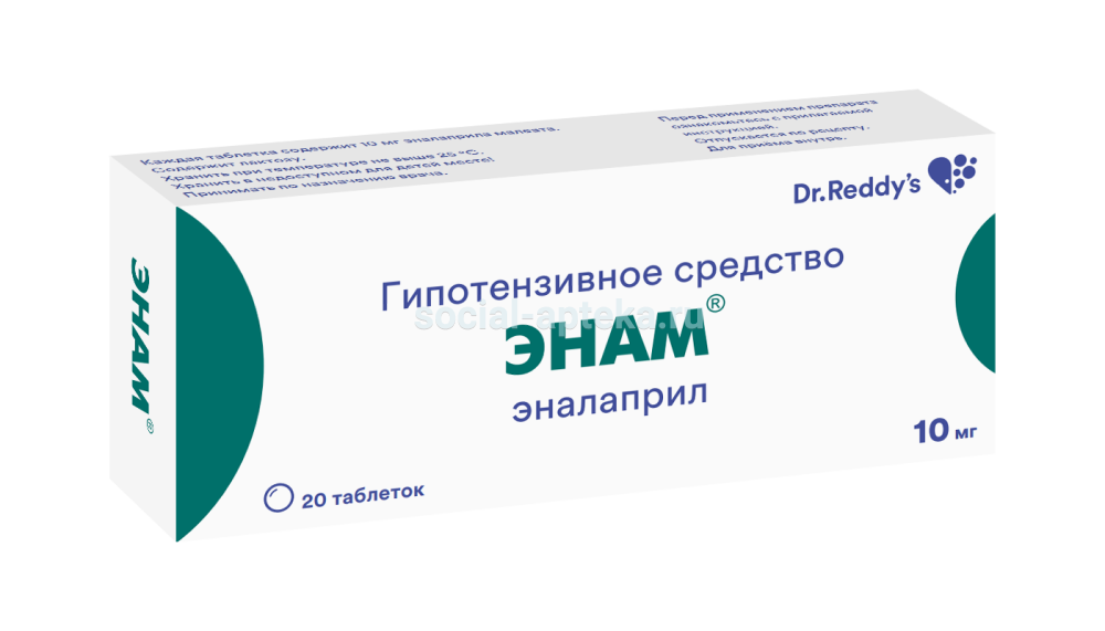 Энам - антигипертензивный препарат, механизм действия которого связан с угнетением активности ангиотензин-превращающего фермента и уменьшением образования ангиотензина II. Эналаприл относится к «пролекарствам»: после гидролиза его в организме образуется эналаприлат, который и ингибирует указанный фермент. Энам® оказывает также некоторый диуретический эффект. Наряду со снижением АД препарат уменьшает пред- и постнагрузку на миокард при сердечной недостаточности, улучшает кровообращение в малом круге и функцию дыхания, понижает сопротивление в сосудах почек, что способствует нормализации в них кровообращения.ФармакокинетикаПосле приема внутрь Энам® быстро и достаточно полно всасывается из ЖКТ. Биодоступность препарата составляет 53–74%, связывание с белками сыворотки крови — 50%. Cmax в крови достигается через 3–4 ч после приема препарата внутрь. Продолжительность действия — 12–24 ч. Препарат метаболизируется в печени, часть гидролизуется в эналаприлат; у больных с нарушениями функции печени время максимального действия может увеличиваться. Препарат выводится почками. Т1/2 составляет около 11 ч.