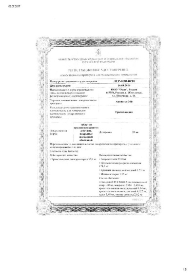 Состав на 1 таблетку: Активное вещество: триметазидина дигидрохлорид – 35 мг; Вспомогательные вещества (ядро): гипромеллоза – 93,0 мг, целлюлоза микрокристаллическая – 178,9 мг, кремния диоксид коллоидный – 1,55 мг, магния стеарат – 1,55 мг. Вспомогательные вещества (оболочка): Опадрай II 85F240012 Pink: поливиниловый спирт – 4,0 мг, макрогол 3350 – 2,438 мг, краситель железа оксид красный – 0,04 мг, краситель железа оксид желтый – 0,022 мг, тальк – 1,48 мг, титана диоксид – 2,02 мг.