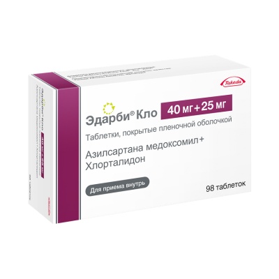 Эдарби® Кло — это комбинированный препарат, в состав которого входят антагонист рецепторов ангиотензина II (АРАII — азилсартана медоксомил) и тиазидоподобный диуретик (хлорталидон). Одновременное применение двух действующих веществ приводит к более выраженному снижению АД по сравнению с таковым при приеме каждого из них в монотерапии. При приеме препарата один раз в сутки достигается эффективное снижение АД в течение 24 ч.Азилсартана медоксомил — одно из действующих веществ препарата Эдарби® Кло — является специфическим антагонистом рецепторов ангиотензина II типа 1 (АТ1). Ангиотензин II образуется из ангиотензина I в реакции, катализируемой АПФ (кининаза II). Ангиотензин II является основным сосудосуживающим фактором РААС, его действие включает в себя сужение сосудов, стимуляцию синтеза и секреции альдостерона, усиление ЧСС и реабсорбцию натрия почками. Азилсартана медоксомил — это пролекарство для приема внутрь. Азилсартана медоксомил быстро превращается в активную молекулу азилсартана, которая избирательно препятствует развитию эффектов ангиотензина II путем блокирования его связывания с рецепторами АТ1 в различных тканях, например в гладких мышцах сосудов и надпочечниках. Поэтому его действие не связано с путем биосинтеза ангиотензина II.Рецептор AT2 также находится во многих тканях, но он не участвует в регуляции деятельности ССС. Аффинность азилсартана к рецептору AT1 в 10000 раз выше, чем к рецептору AT2.Угнетение активности РААС посредством ингибиторов АПФ, подавляющих образование ангиотензина II из ангиотензина I, широко применяется при лечении артериальной гипертензии. Ингибиторы АПФ подавляют также распад брадикинина, который катализируется АПФ. Поскольку азилсартан не подавляет АПФ(кининазу II), он не должен влиять на активность брадикинина. Азилсартан не связывается с другими рецепторами или ионными каналами, играющими важную роль в регуляции ССС, и не блокирует их.Азилсартан дозозависимо подавляет сосудосуживающие эффекты инфузии ангиотензина II. Однократный прием азилсартана в дозе, эквивалентной 32 мг азилсартана медоксомила, подавлял максимальное сосудосуживающее действие ангиотензина II примерно на 90% в момент наибольшей концентрации, и примерно на 60% через 24 ч после приема. У здоровых добровольцев концентрации ангиотензина I и ангиотензина II и активность ренина в плазме крови возрастали, а концентрация альдостерона снижалась после однократного приема внутрь и после повторных доз азилсартана медоксомила; клинически значимое влияние на содержание калия или натрия в сыворотке крови не обнаружено. В целом фармакодинамические свойства азилсартана медоксомила согласуются с блокированием рецептора AT1.Антигипертензивный эффект азилсартана медоксомила развивается в течение первых 2 нед применения с достижением максимального терапевтического эффекта через 4 нед. Снижение АД после приема внутрь однократной дозы обычно достигается в течение нескольких часов и сохраняется в течение 24 ч.Хлорталидон — тиазидоподобный диуретик — подавляет активную реабсорбцию ионов натрия в почечных канальцах (начальная часть дистального извитого канальца нефрона), увеличивая выведение ионов натрия и хлора и усиливая диурез. Кроме того, хлорталидон увеличивает выведение ионов калия, магния и бикарбоната, задерживает