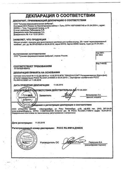 Снижает абсорбцию ципрофлоксацина, этидроновой кислоты, антибиотиков группы тетрациклина (образует неабсорбированные комплексы с пероральными тетрациклинами), ослабляет действие стрептомицина и тобрамицина (слабительные магнийсодержащие лекарственные препараты, следует принимать через 1-2 ч после применения вышеуказанных лекарственных средств).