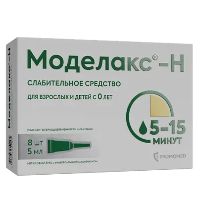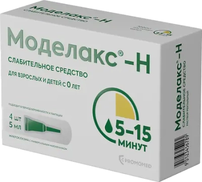 Моделакс®-Н – комбинированный препарат, оказывающий слабительное действие. Эффект наступает через 5 – 15 минут. В состав препарата входят натрия цитрат (пептизатор, который вытесняет связанную воду, содержащуюся в каловых массах), натрия лаурилсульфоацетат (разжижает содержимое кишечника) и сорбит (усиливает слабительное действие путем стимуляции поступления воды в кишечник). Увеличение количества воды за счет пептизации и разжижения способствует размягчению каловых масс и облегчает опорожнение кишечника.