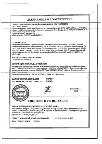 Торендо - антипсихотическое средство (нейролептик). Фармакодинамика Рисперидон является антипсихотическим средством, оказывает также седативное, противорвотное и гипотермическое действие. Рисперидон является селективным моноаминергическим антагонистом с выраженным сродством к серотонинергическим 5-НТ2 и дофаминергическим D2-рецепторам, связывается также с альфа1-адренорецепторами и при несколько меньшей аффинности с Н1-гистаминергическими и альфа2-адренергическими рецепторами. Не обладает тропностью к холинорецепторам. Антипсихотическое действие обусловлено блокадой дофаминовых D2-рецепторов мезолимбической и мезокортикальной системы.Седативное действие обусловлено блокадой адренорецепторов ретикулярной формации ствола головного мозга; противорвотное действие - блокадой дофаминовых D2-рецепторов триггерной зоны рвотного центра; гипотермическое действие - блокадой дофаминовых рецепторов гипоталамуса. Снижает продуктивную симптоматику (бред, галлюцинации), автоматизм. Вызывает меньшее подавление моторной активности и в меньшей степени индуцирует каталепсию, чем классические антипсихотики (нейролептики). Сбалансированный центральный антагонизм к серотонину и дофамину может уменьшать риск возникновения экстрапирамидной симптоматики. Рисперидон может вызывать дозозависимое увеличение концентрации пролактина в плазме.Фармакокинетика При приёме внутрь рисперидон полностью всасывается (независимо от приема пищи) и максимальные уровни концентрации в плазме крови наблюдаются через 1-2 часа. Рисперидон подвергается метаболизму с участием Р-450 IID6 цитохрома с образованием 9-гидрокси-рисперидона, который обладает аналогичным фармакологическим действием. Рисперидон и 9-гидрокси-рисперидон представляют собой эффективную антипсихотическую фракцию. Дальнейший метаболизм рисперидона заключается в N-деалкилировании. При приёме внутрь рисперидон выводится с периодом полувыведения около 3 часов. Установлено, что период полувыведения 9-гидрокси-рисперидона и активной антипсихотической фракции составляет 24 часа.У большинства пациентов равновесная концентрация рисперидона наблюдается через один день после начала лечения. Равновесное состояние 9-гидрокси-рисперидона в большинстве случаев достигается через 3-4 дня после начала лечения. Концентрация рисперидона в плазме пропорциональна дозе препарата (в пределах терапевтических доз). Рисперидон быстро распределяется в организме. Объём распределения составляет 1-2 л/кг. В плазме рисперидон связан с альбумином и кислым альфа-1-гликопротеином. Фракция рисперидона, которая связана белком плазмы, составляет 88% и 77%, соответственно, в случае 9-гидрокси-рисперидона. Выводится почками - 70% (из них 35-45% в виде фармакологически активной фракции) и 14% с желчью. При однократном приеме отмечаются высокие уровни активных концентраций в плазме и медленное выведение у пожилых пациентов и больных с недостаточной функцией почек.