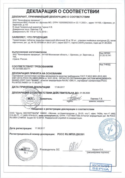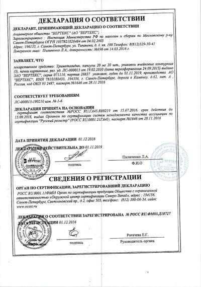Фармакологическое действие - антиангинальное, антигипоксическое, цитопротективное, метаболическое.Непосредственно влияет на кардиомиоциты и нейроны головного мозга, оптимизируя их метаболизм и функции. Цитопротекция обусловлена обеспечением достаточного энергетического потенциала, активацией окислительного декарбоксилирования и рационализацией потребления кислорода (усиление аэробного гликолиза и блокада окисления жирных кислот). Поддерживает сократимость миокарда, предотвращает внутриклеточное истощение АТФ и фосфокреатинина. В условиях ацидоза нормализует функционирование ионных каналов мембран, препятствует накоплению кальция и натрия в кардиомиоцитах, нормализует внутриклеточное содержание калия.Уменьшает внутриклеточный ацидоз и содержание фосфатов, обусловленные ишемией миокарда и реперфузией. Препятствует повреждающему действию свободных радикалов, сохраняет целостность клеточных мембран, предотвращает активацию нейтрофилов в зоне ишемии, увеличивает продолжительность электрического потенциала, уменьшает выход креатинфосфокиназы из клеток и выраженность ишемических повреждений миокарда.При стенокардии сокращает частоту приступов (уменьшается потребление нитратов), через 2 нед лечения повышается толерантность к физической нагрузке, снижаются перепады АД.Улучшает слух и результаты вестибулярных проб у пациентов с патологией лор-органов, уменьшает головокружение и шум в ушах. При сосудистой патологии глаз восстанавливает функциональную активность сетчатки.Полностью и быстро абсорбируется из ЖКТ, биодоступность — 90%. Tmax — 2 ч. Cmax после однократного перорального приема 20 мг триметазидина составляет 55 нг/мл. Связывание с белками плазмы — 16%. Объем распределения — 4,8 л/кг. Легко проходит через гистогематические барьеры. Почти половина введенного количества подвергается биотрансформации. T1/2 около 6 ч. 51% выводится в неизмененном виде почками.