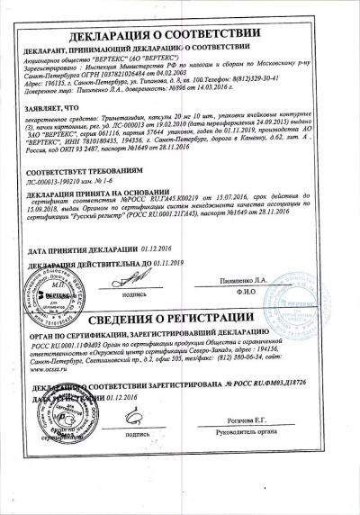 1 таблетка, покрытая пленочной оболочкой, содержит: действующее вещество: триметазидина дигидрохлорид — 20 мг вспомогательные вещества: гипролоза (гидроксипропилцеллюлоза) 0,7 мг, крахмал кукурузный 16 мг, кремния диоксид коллоидный (аэросил) 3,13 мг, лактозы моногидрат (сахар молочный) 89,47 мг, магния стеарат 0,7 мг. состав пленочной оболочки: селекоат AQ–01673 — 6 мг: гипромеллоза (гидроксипропилме-тилцеллюлоза) 2,4 мг, макрогол–400 (полиэтиленгликоль–400) 0,6 мг, макрогол–6000 (полиэтиленгликоль–6000) 0,6 мг, краситель пунцовый [Понсо 4 R] 0,6 мг, титана диоксид 1,8 мг